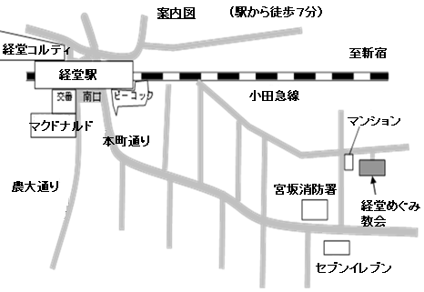 北口から経堂テラスガーデン(小田急線高架下 新宿方面)へ向かい、200m先右手のペットサロンを右折、すぐ先のT字路を左折、まっすぐ200ⅿ行くと右側が教会です。